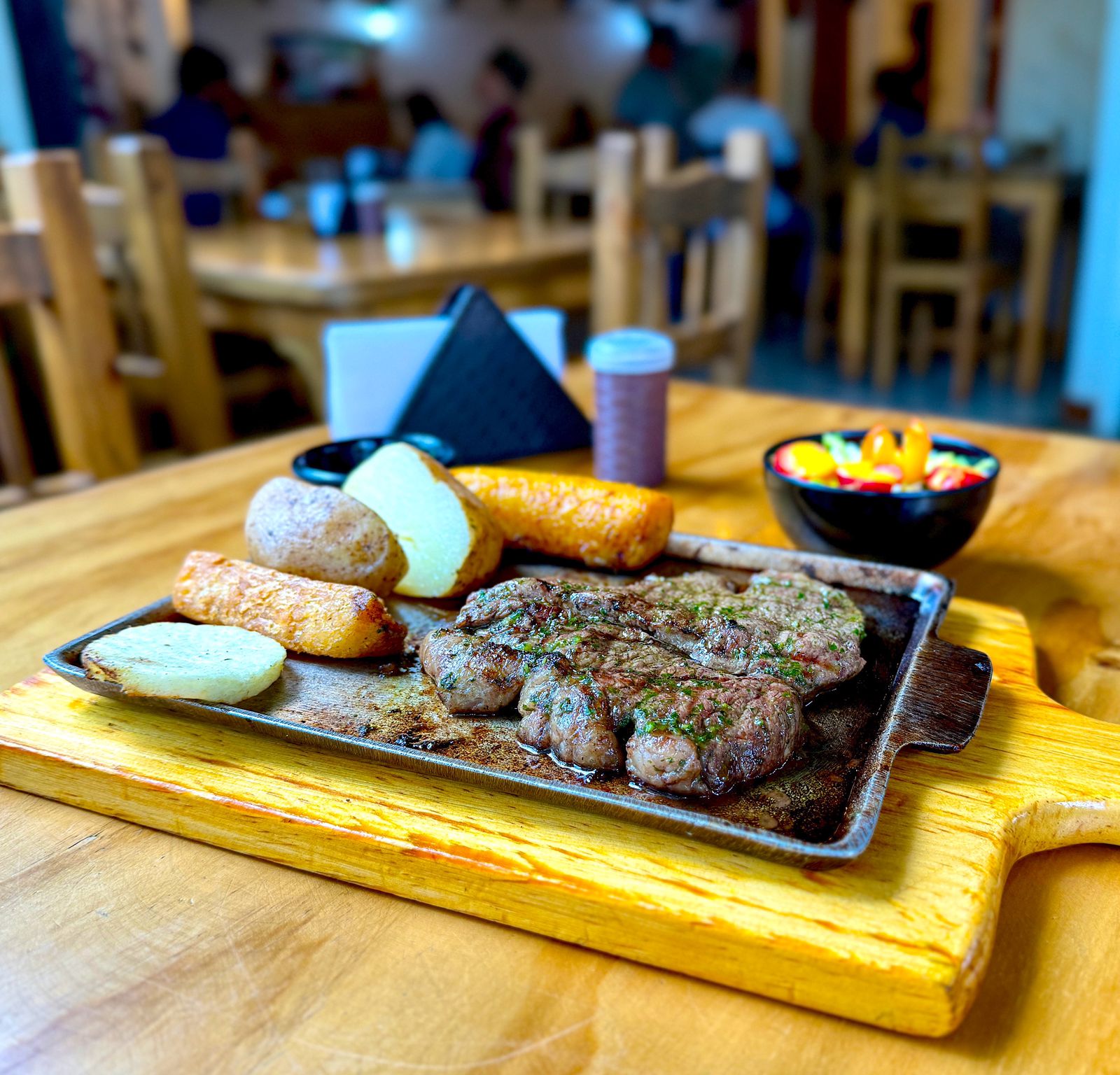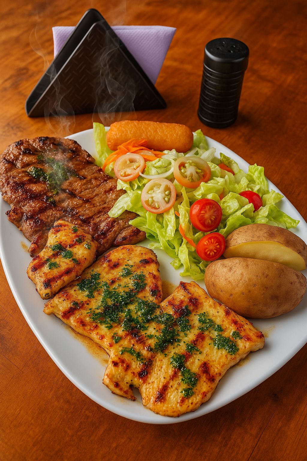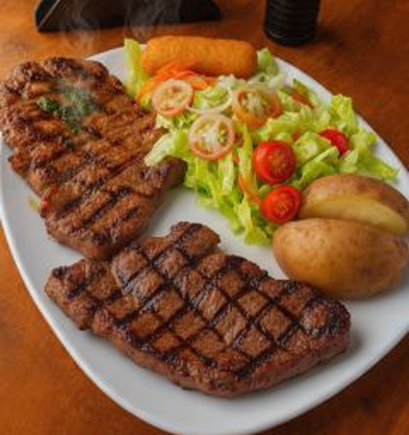 Churrasco 300 g, acompañado de maduro, papa al vapor con guacamole y ensalada.