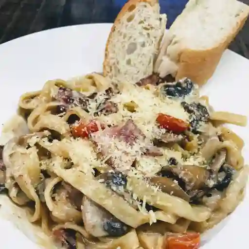 Pasta fetuccine, base alfredo, pollo, tocineta, champiñones, tomate cherry y queso parmesano.