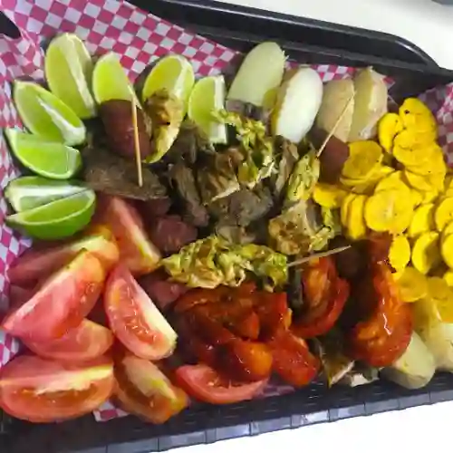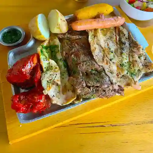 Carnes a la parrilla 400 g, (res, cerdo, pollo, chorizo y costilla), acompañada de maduro, papa al vapor y ensalada.