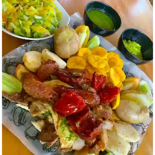 Con chicharrón, res, cerdo, pollo, costilla, chorizo, papa al vapor, monedas del plátano, tomate, arepa, guacomole, ensalada y chimichurri.