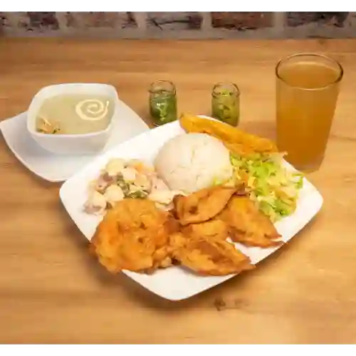 Acompañado de arepa, arroz blanco y bebida