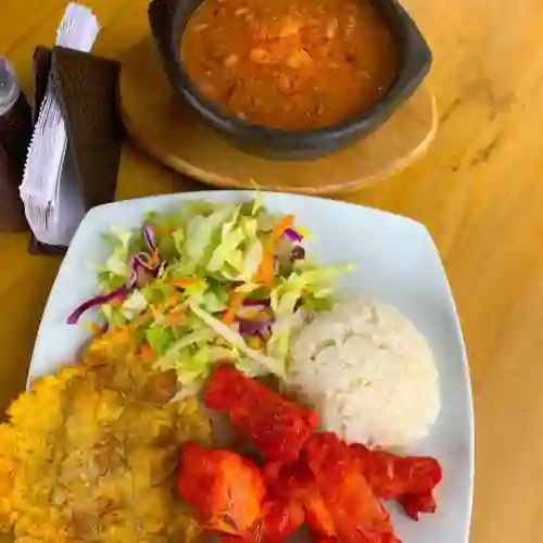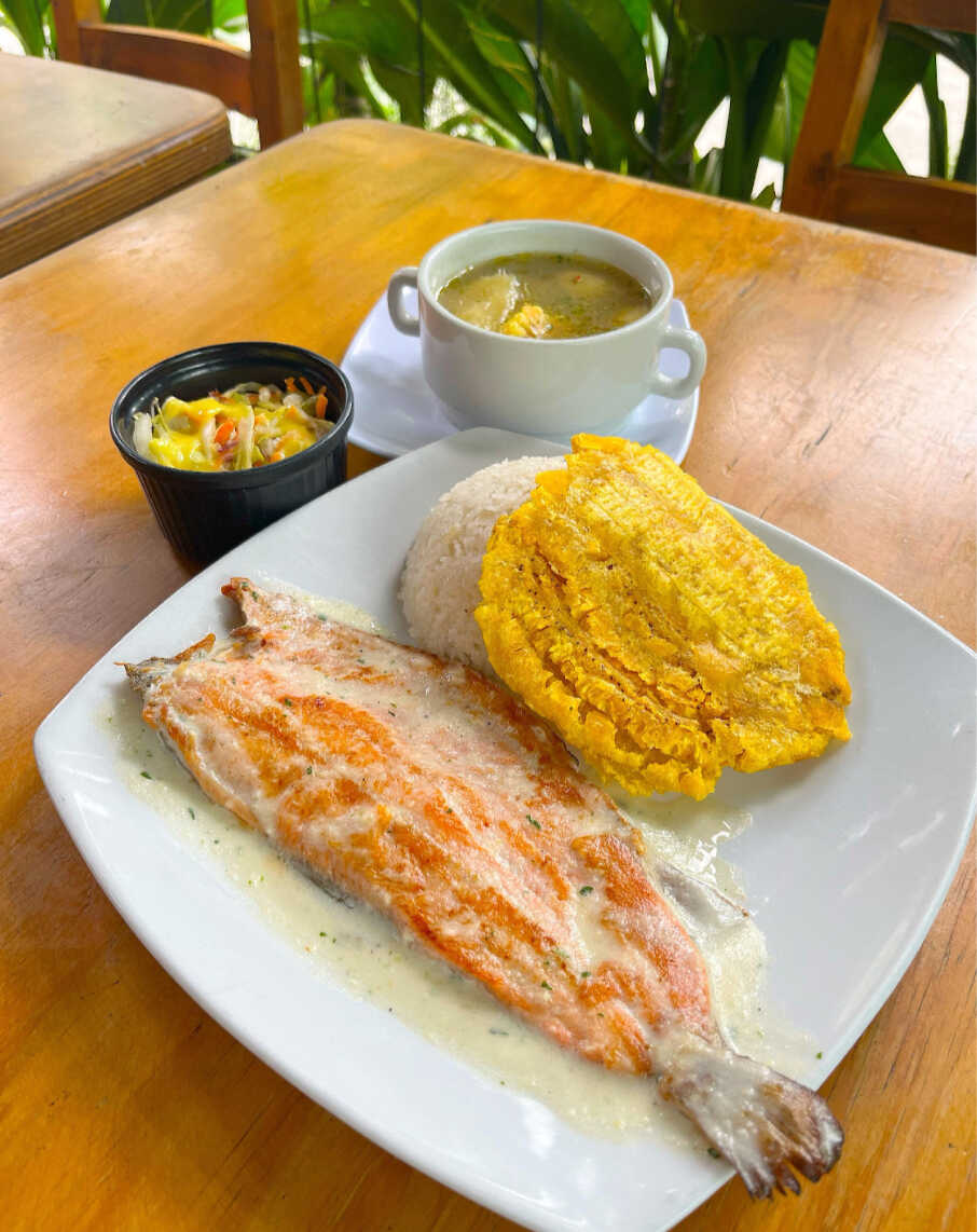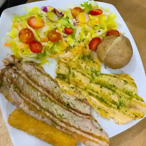 Tilapia frita de 400 g, acompañada de arroz, patacón y ensalada de aguacate.