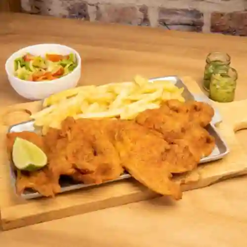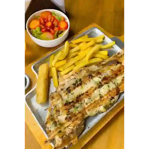 Pechuga de 250 g, con papas a la francesa, bastón de yuca y ensalada.