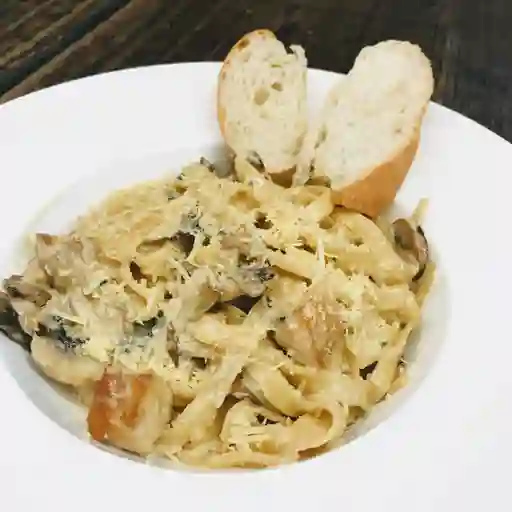 Pasta fetuccine, base alfredo, pollo, champiñones y queso parmesano.