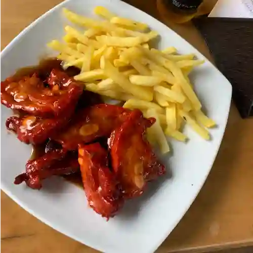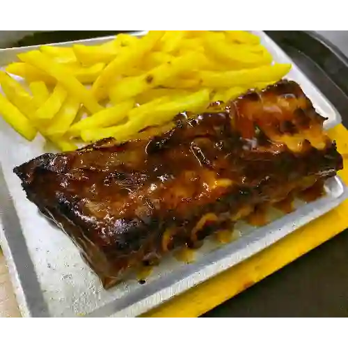 Costilla ahumada en salsa a la BBQ de la casa 300 g, papas a la francesa y ensalada.