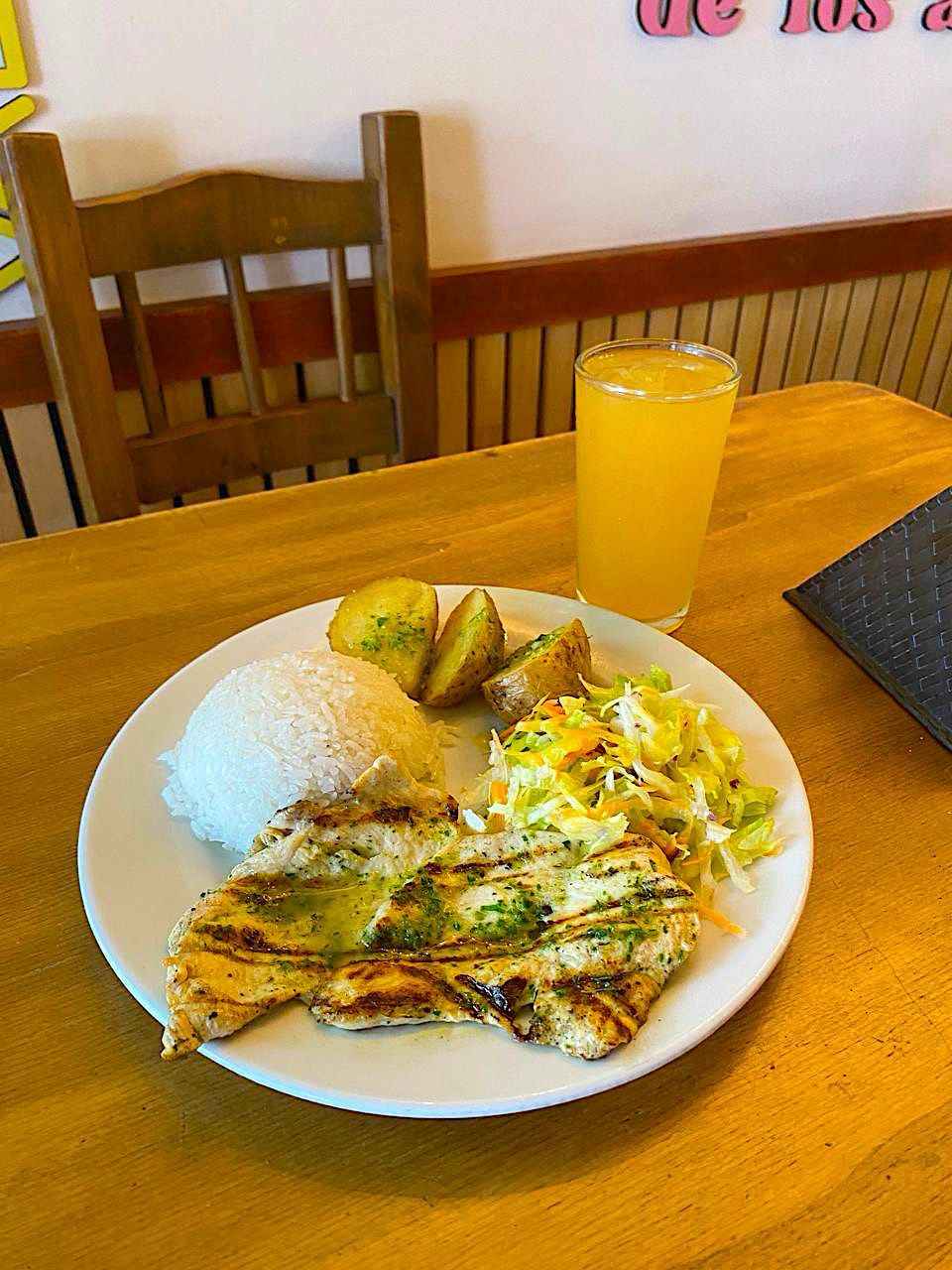 Chuleta de cerdo o pollo, acompañado de sopa del día, principio del día o frijoles, arroz, ensalada, maduro y agua de panela con limón.