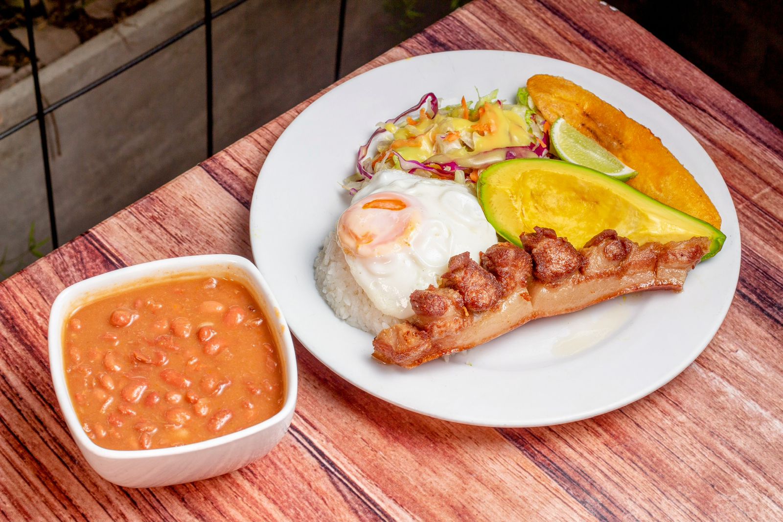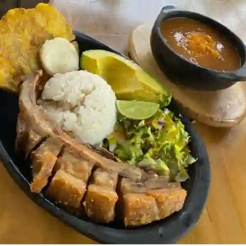 Frijoles con hogao, costilla ahumada 300 g, acompañada de tostada de plátano, arroz y ensalada de la casa.