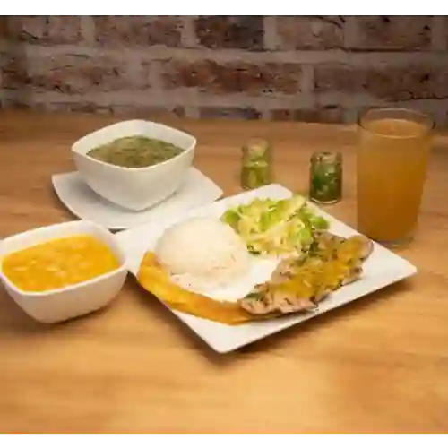 Proteína del día 100gr, acompañado de sopa del día 12oz, principio del día o frijoles, arroz, ensalada, 1 maduro y agua de panela con limón 9oz.