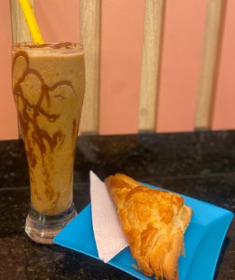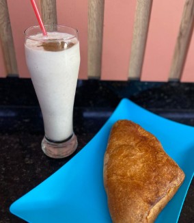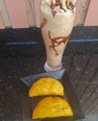 Empanada (rellena de guiso de carne desmechada y papa) con granizado de café.