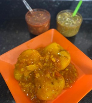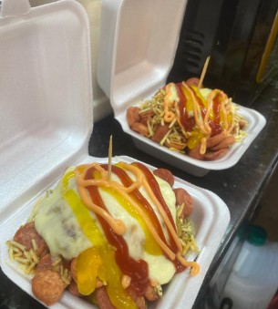 Salchipapa con salchicha, papa amarilla, queso mozzarella, ripio de papa, trozos de costilla, salsa de tomate, salsa rosada, salsa de piña y salsa de la casa (salsa de ajo).
