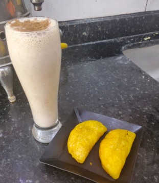Empanada (rellena de guiso de carne desmechada y papa) con deliciosa avena casera.