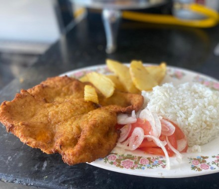 Chuleta de pollo con arroz, ensalada de cebolla y tomate, papas a la francesa acompañadas de aguapanela con limón.