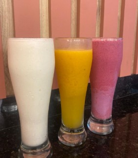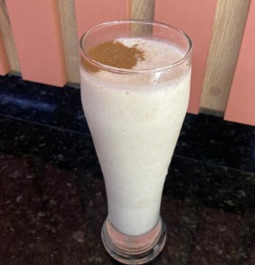 Jugo natural en leche con fruta a elección.