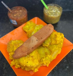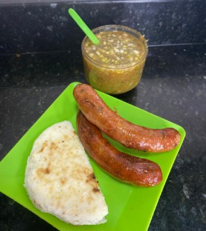 Chorizo de cerdo acompañado con media papa aborrajada o arepa.