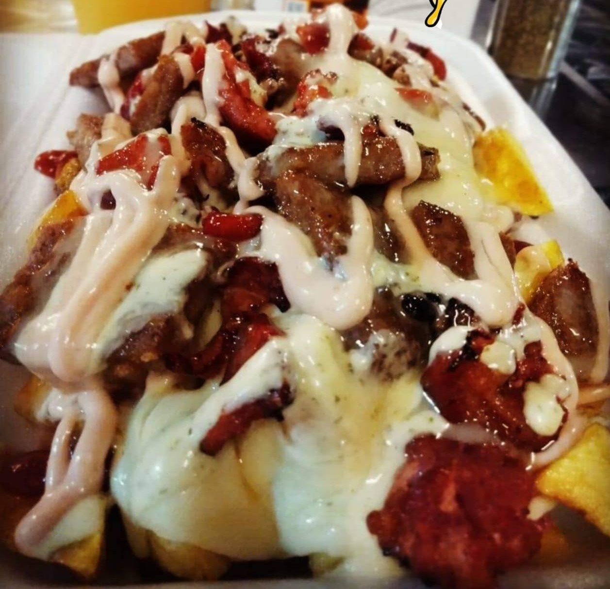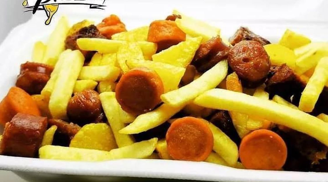 Papa a la francesa, papa amarilla, salchicha, chorizo, carne hamburguesa, tocineta, doble queso gratinado y salsas (tomate, rosada, ajo, piña).