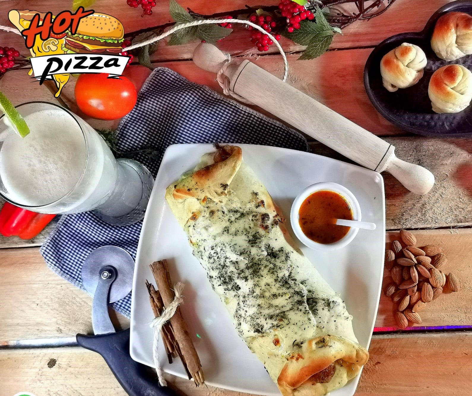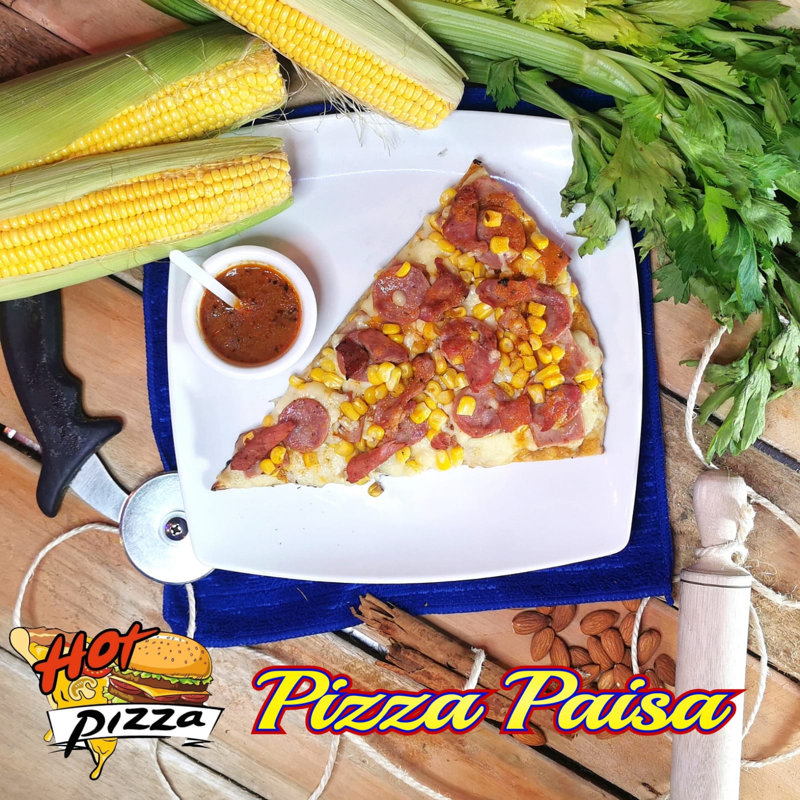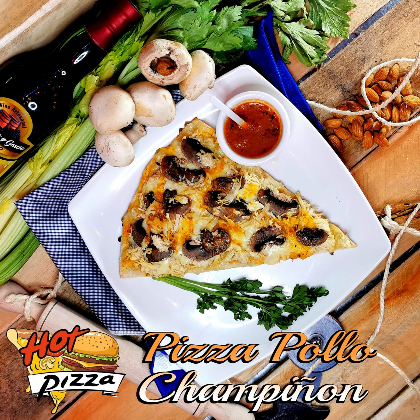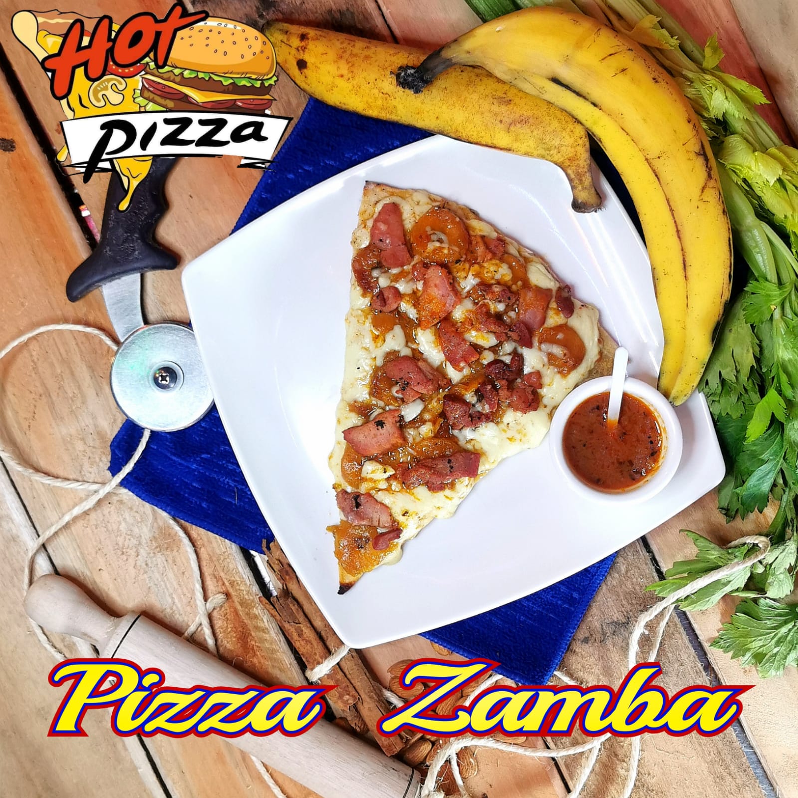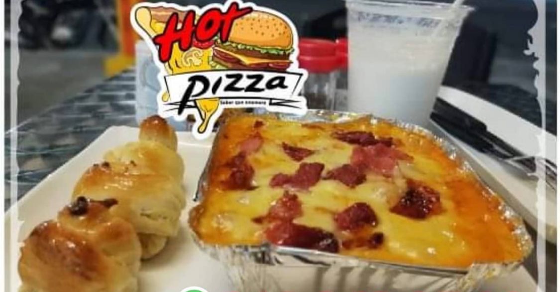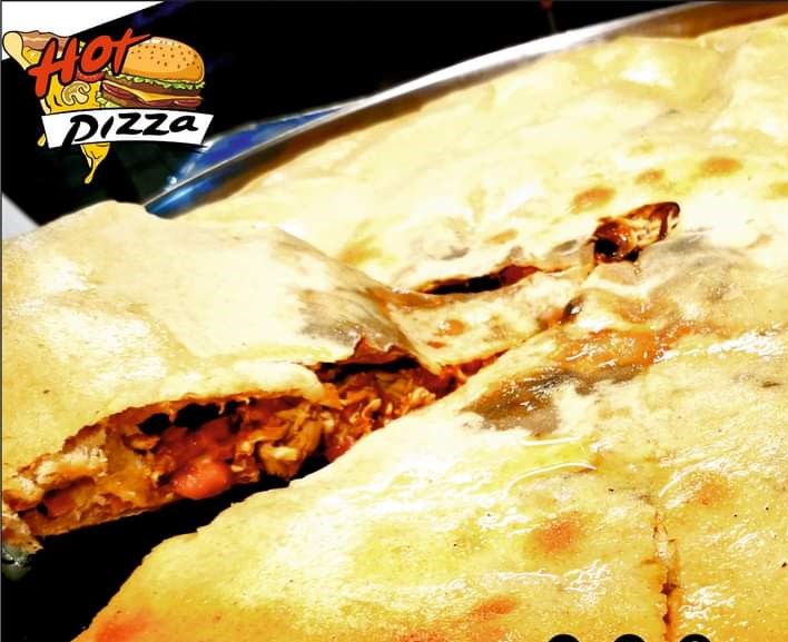 Pan pizza, salchicha americana, pollo, tocineta, piña calada, jamón, queso, papitas y salsas (tomate, rosada, ajo, piña).