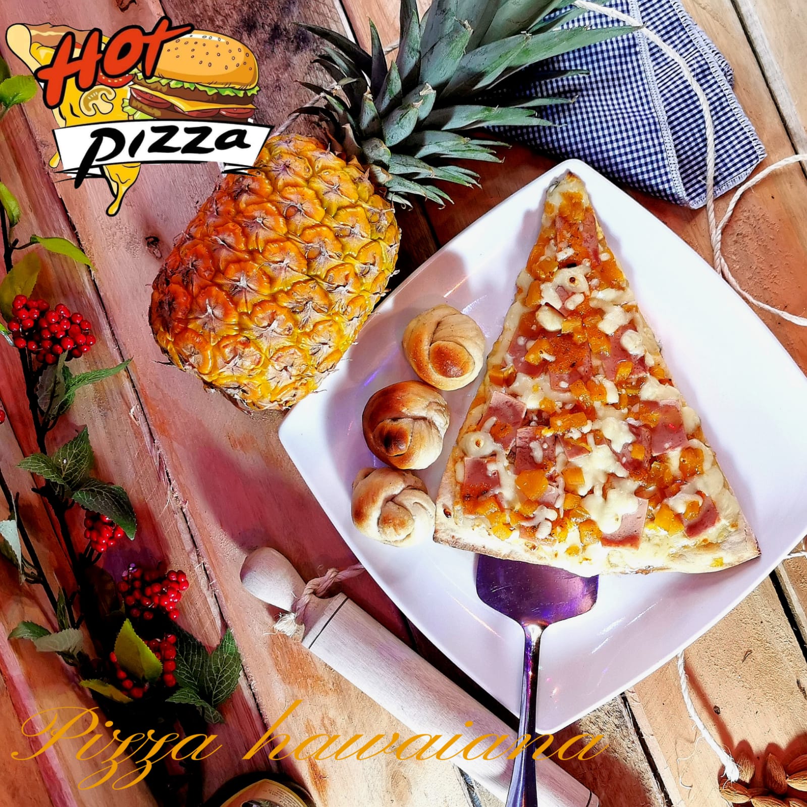 Pan de pizza, carne de res, queso, tocineta, piña calada, jamón, vegetales y salsas (tomate, rosada, ajo, piña).