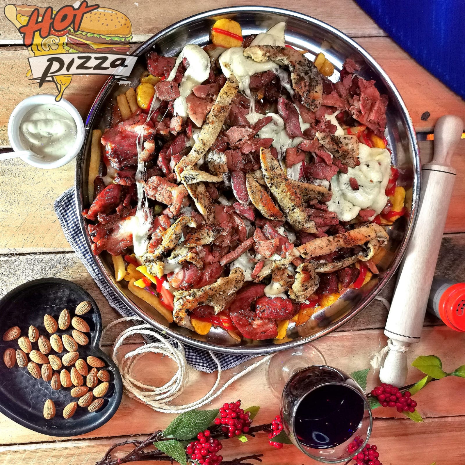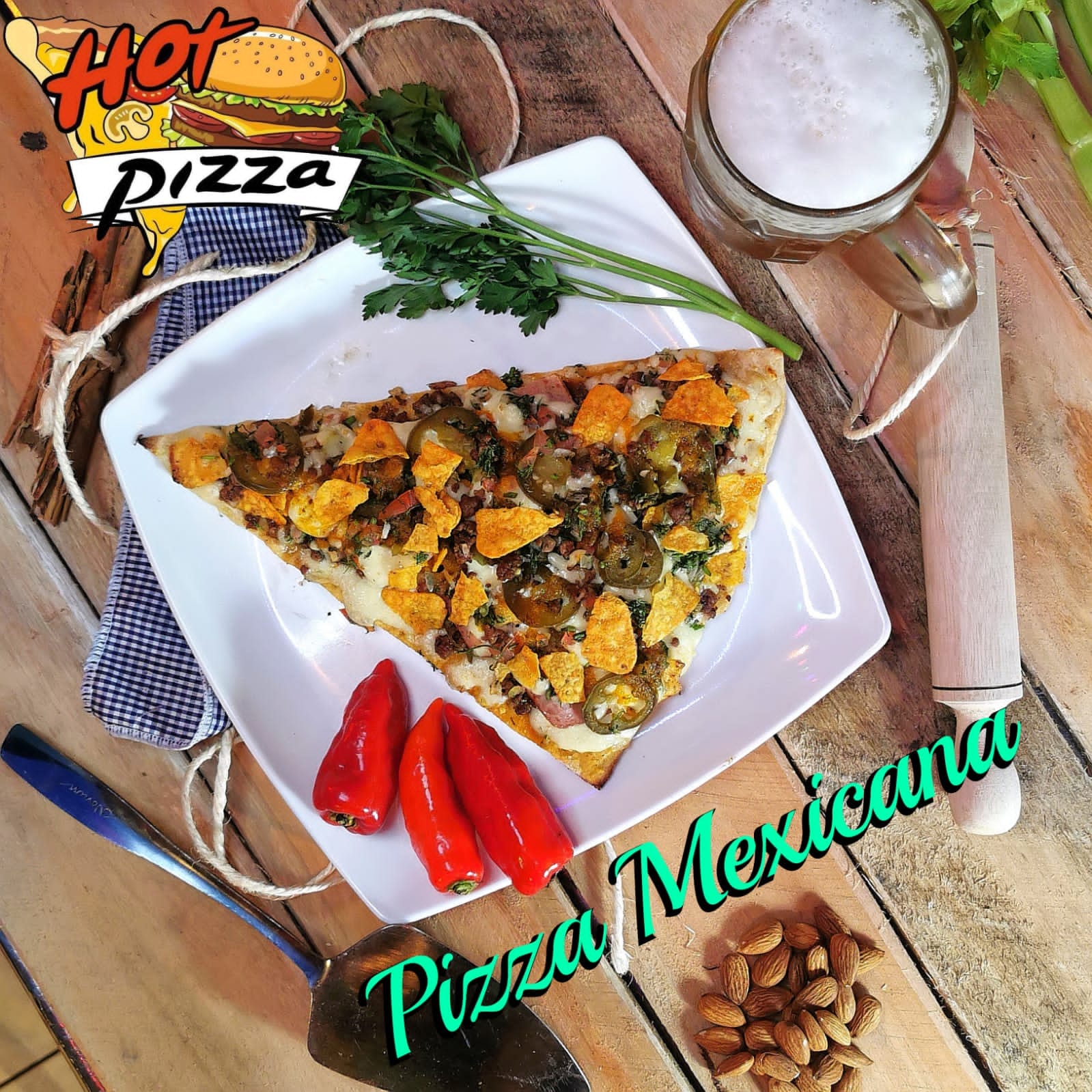 Queso mozzarella, carne, jalapeño, jamón, pico de gallo y tacos.