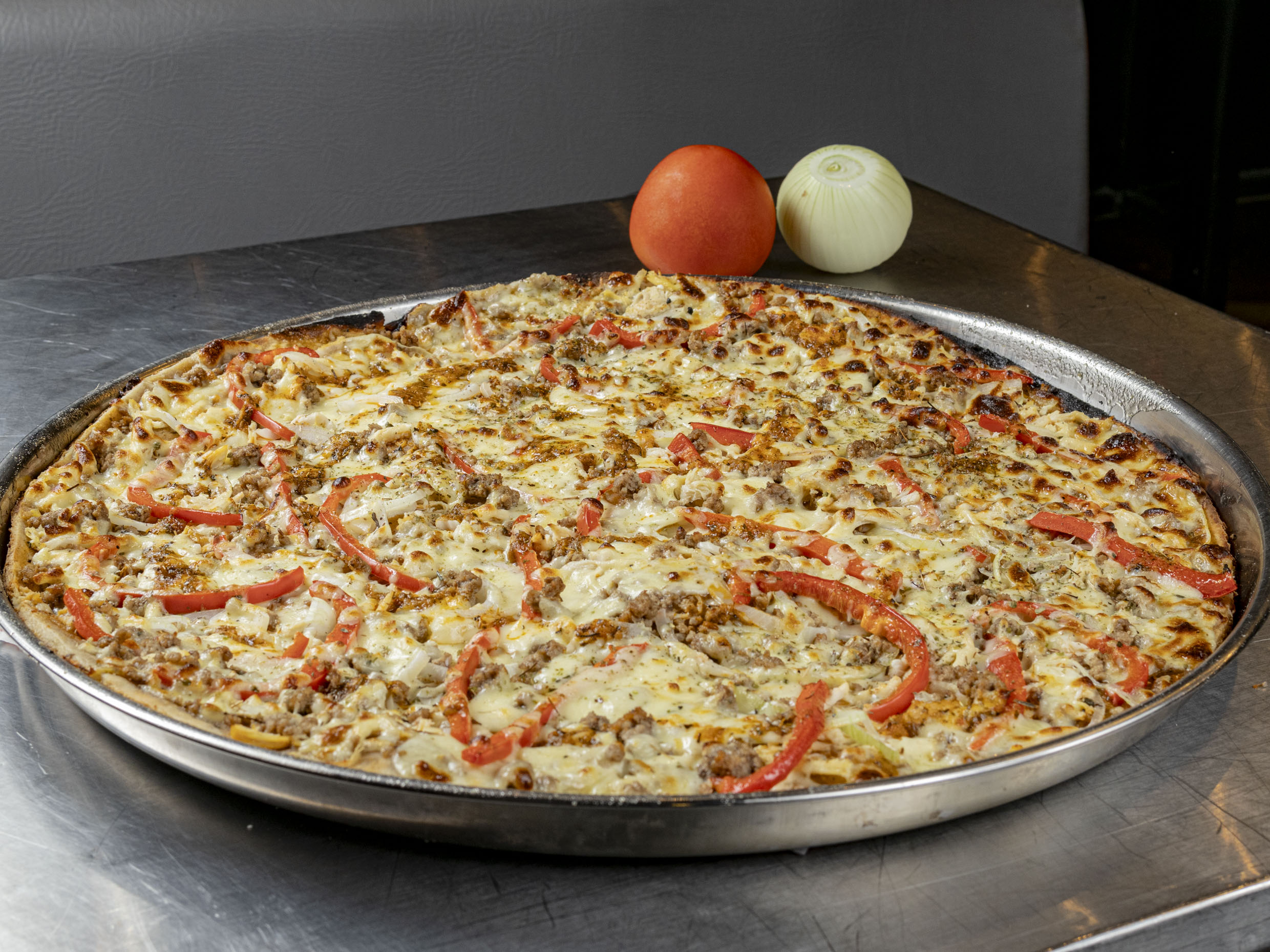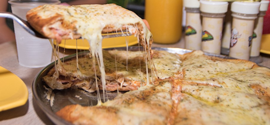 Doble queso mozzarella, queso crema, jamón, cabano, salami, pimentón, cebolla y orégano.
