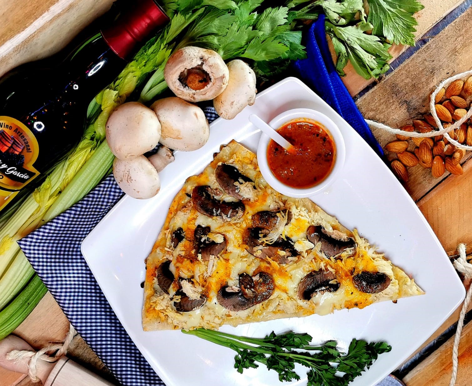 Queso mozzarella, carne desmechada, tomate, cebolla, pimentón y salsa teriyaki.