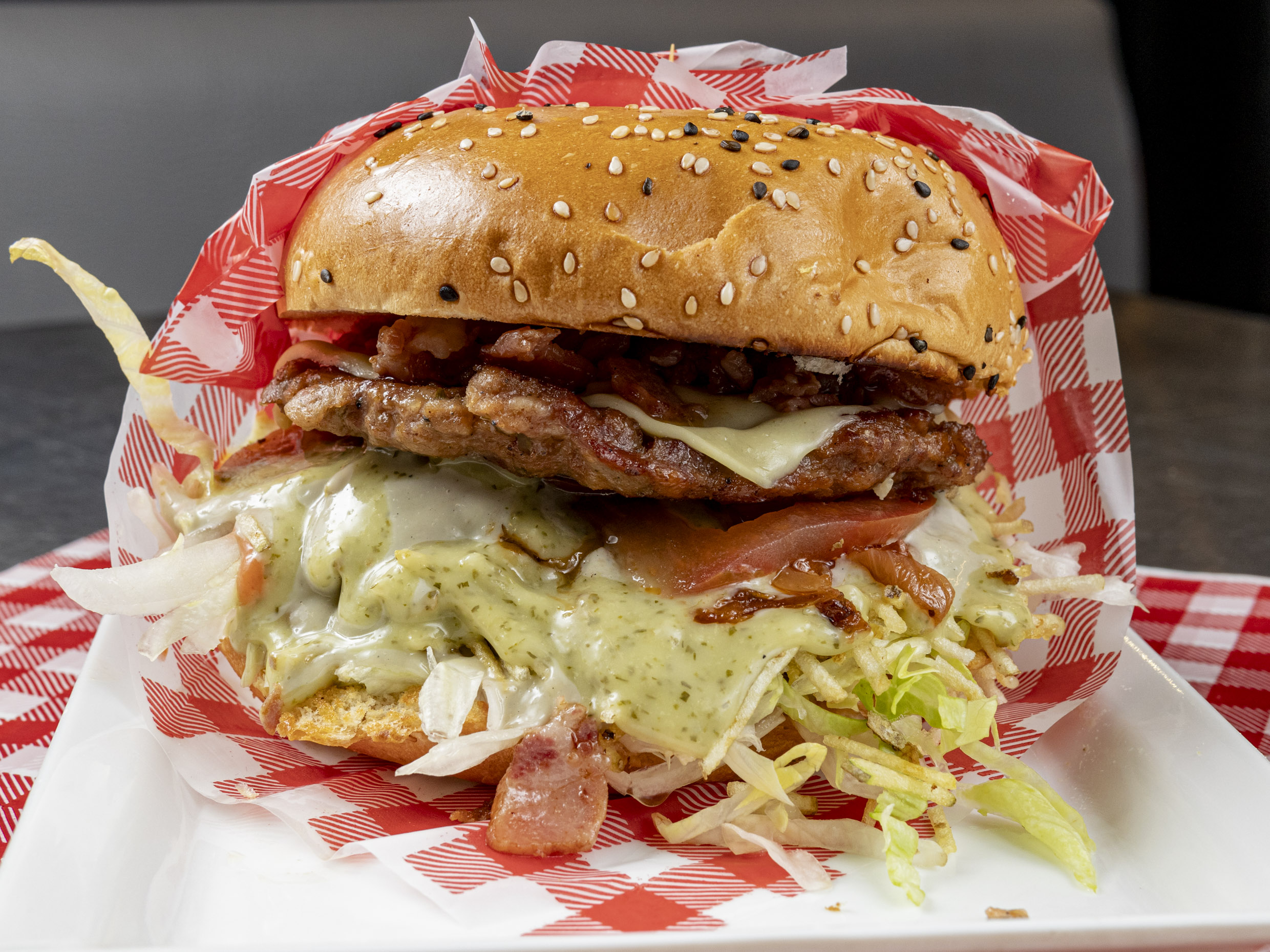 Doble carne de res, queso, pan, tocineta, piña calada, vegetales y salsas (tomate, rosada, ajo, piña).