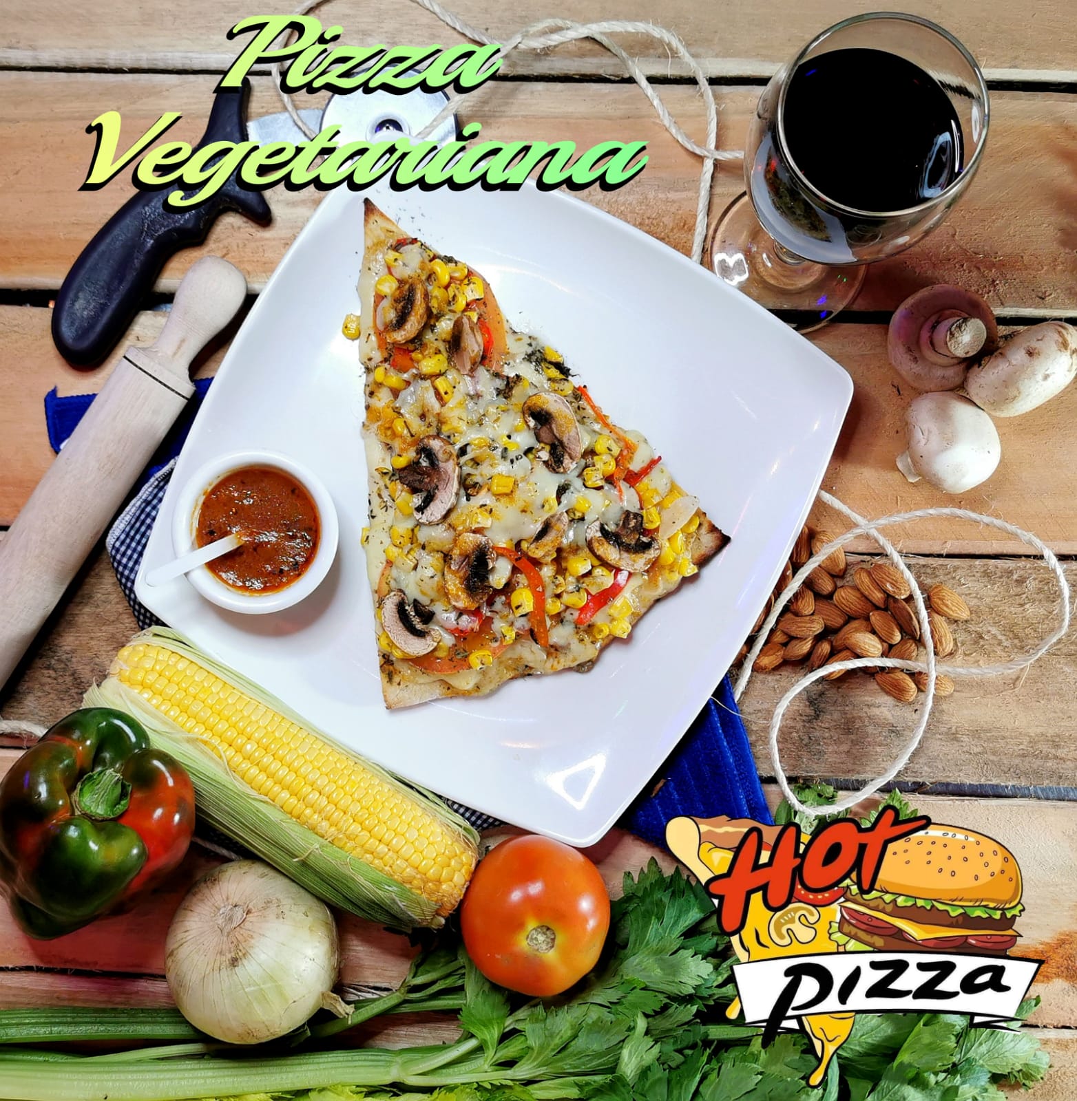 Queso mozzarella, tomate, cebolla, pimentón, maíz, champiñón y orégano.