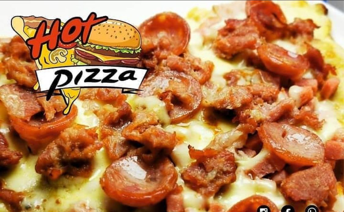 Pan de Pizza, carne de res, queso, tocineta, piña calada, tomate, cebolla, lechuga y salsas (tomate, rosada, ajo, piña).