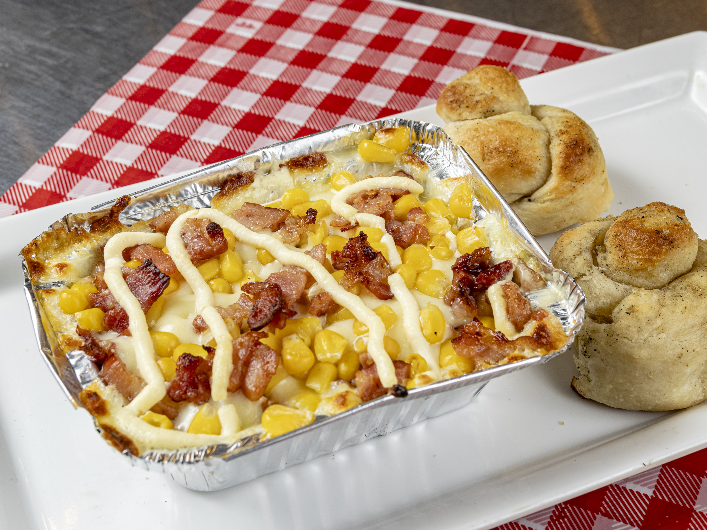 Maíz tierno, queso, tocineta y salsa megaqueso.
