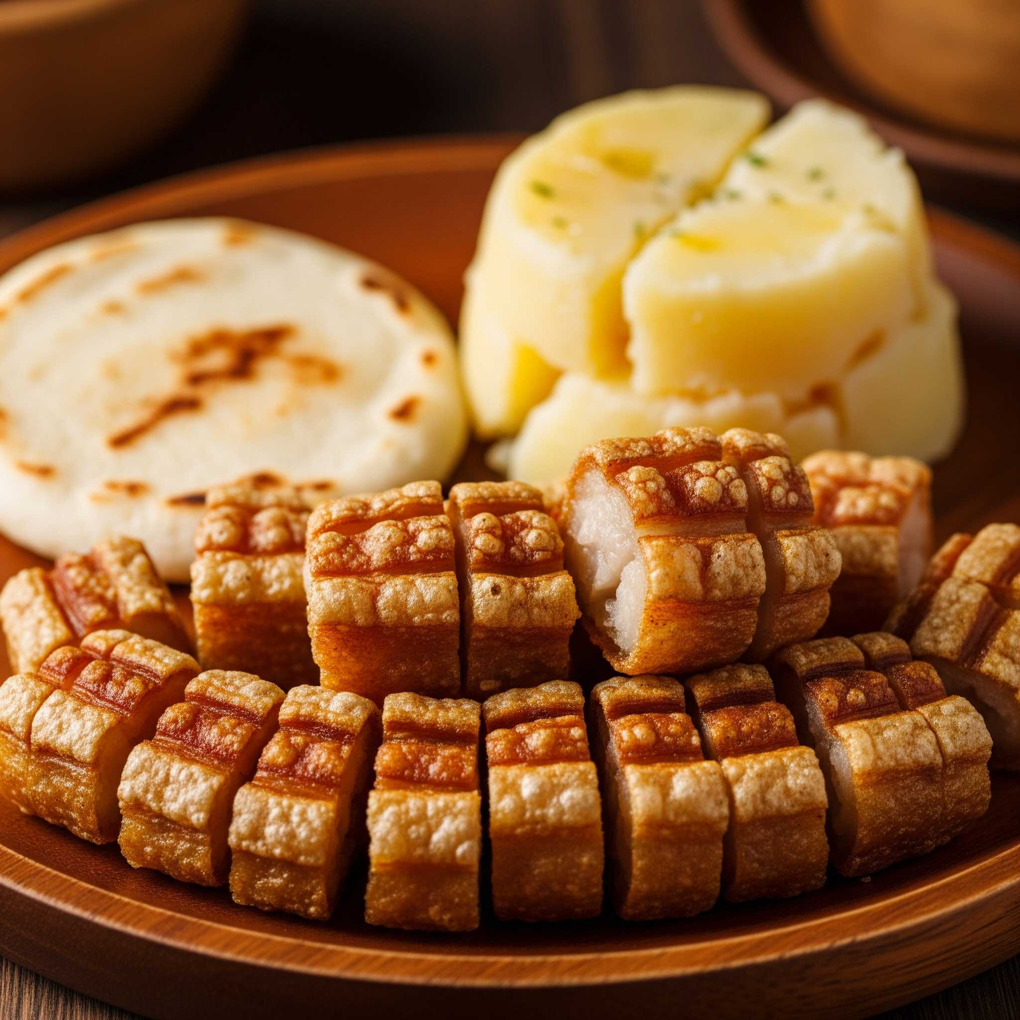 Chicharrón al barril, con 400gr de proteína, acompañado de papa al vapor, maduro y salsa de la casa.