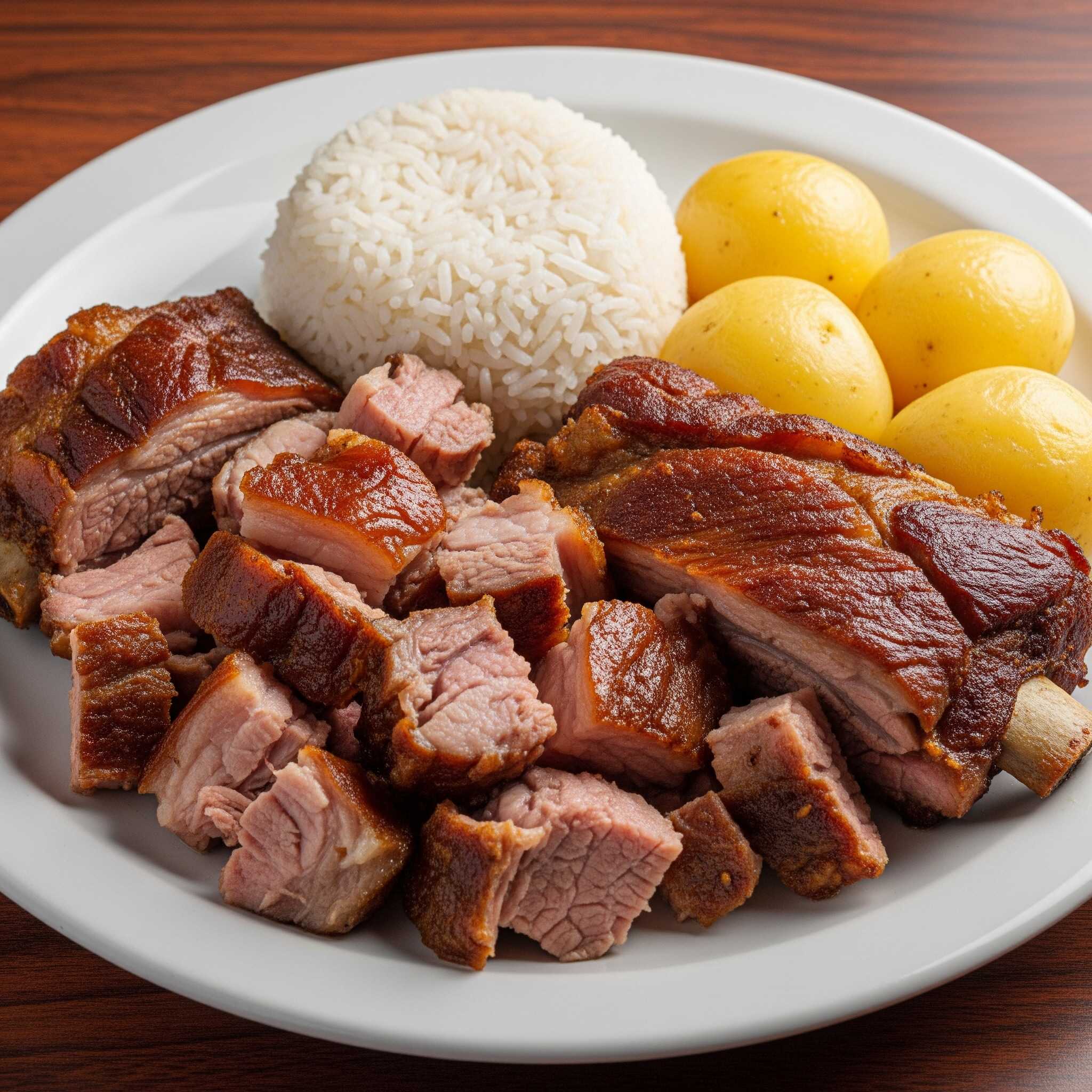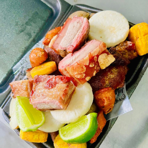 Bondiola, costilla, chicharrón, chorizo al barril, papa al vapor, maduro y salsa de la casa