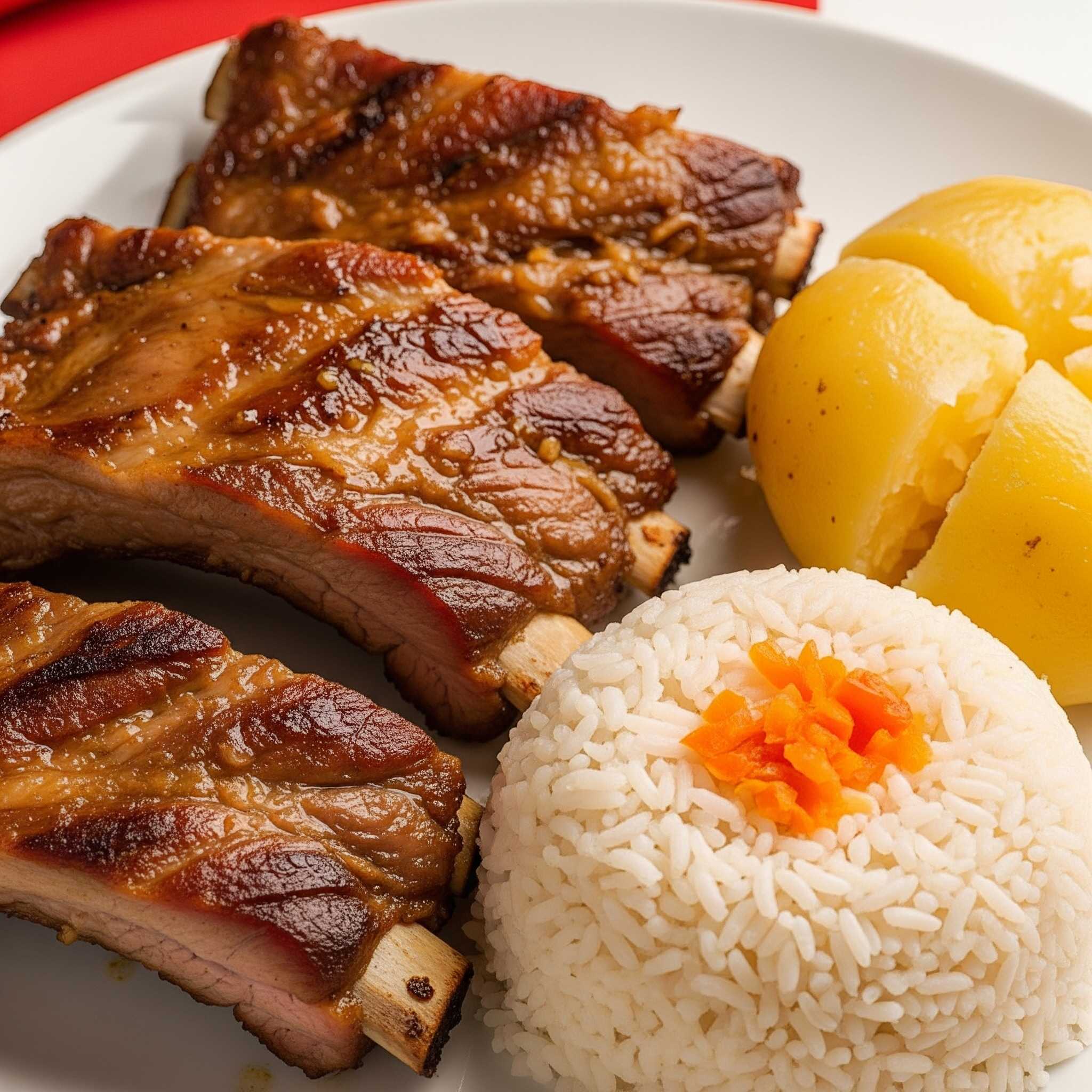 Costilla al barril, con 200gr de proteína, chorizo artesanal, papa al vapor, maduro y salsa de la casa