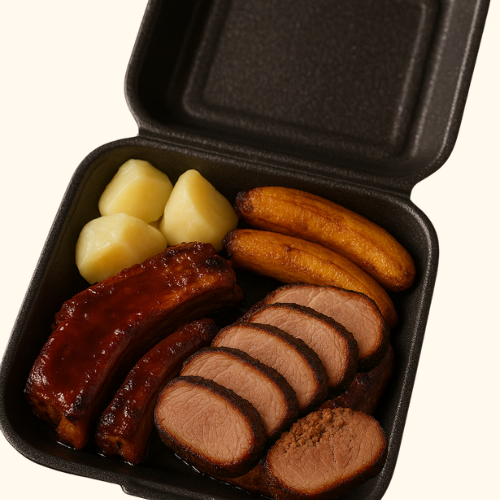 Costilla al barril, con 200gr de proteína, acompañado de papa al vapor, maduro y salsa de la casa