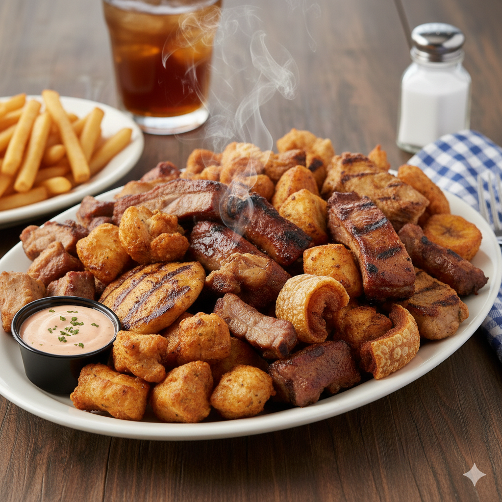 Acompañada de pollo, costilla, carne de cerdo, chicharrón, plátanos y papas a la francesa.