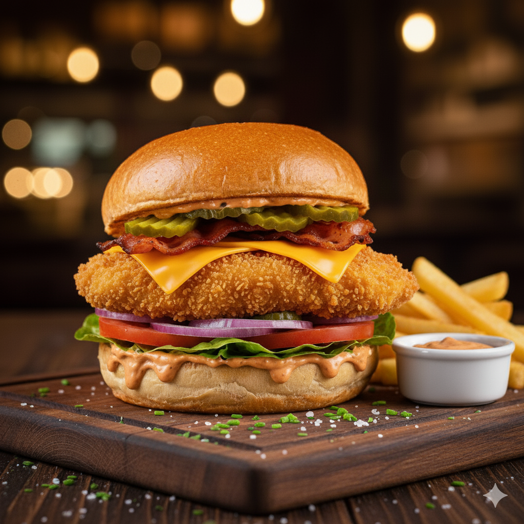 Pollo en panko ,queso Americano, tocineta, pan artesanal, cebolla, tomate, lechuga, alioli y salsa BBQ.