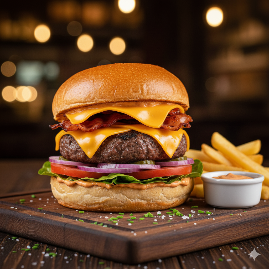 170gr Carne 100% Angus, queso Americano, tocineta, pan artesanal, lechuga, tomate, cebolla y salsa de la casa.
