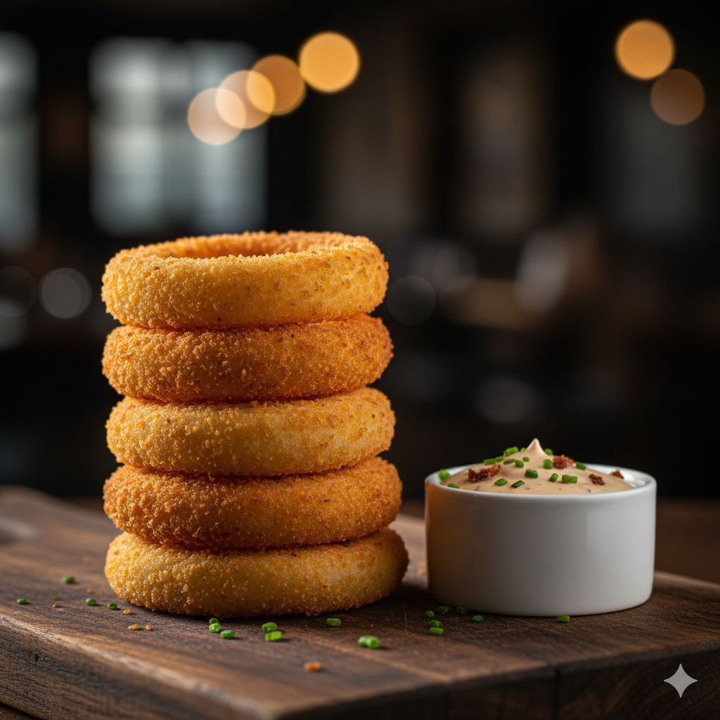 6 Unidades de aros de cebolla, acompañados de mayonesa de tocineta.