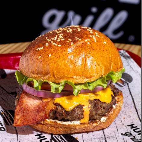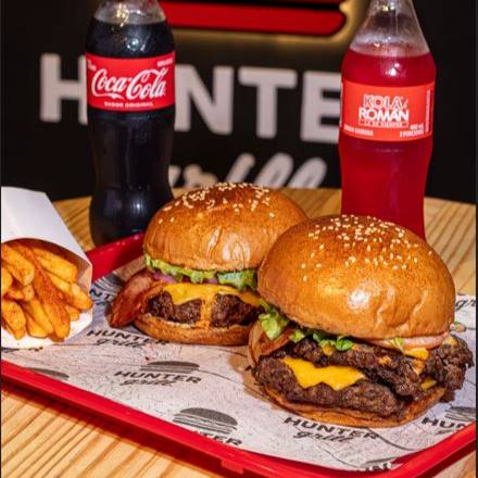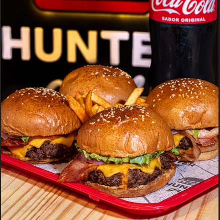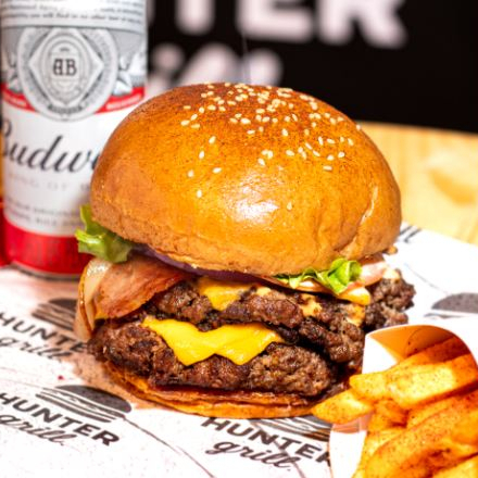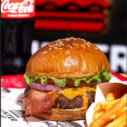 Carne 100% Angus, doble queso americano, tocineta, pan artesanal, tomate, lechuga, cebolla y salsa Hunter.
