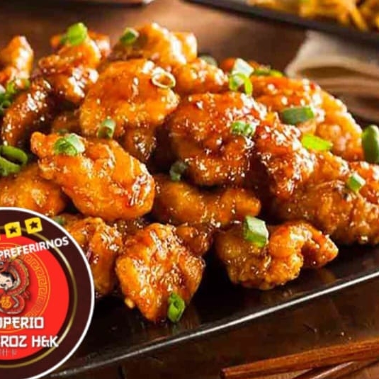 Delicioso pollo a la naranja, acompañado de arroz chino.