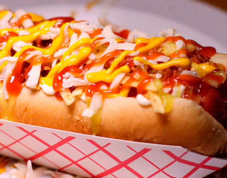 Pan, salchicha viena, ripio papa, cebolla, queso gratinado, tocineta, salsas a elección (tomate, ajo, mostaza, piña).