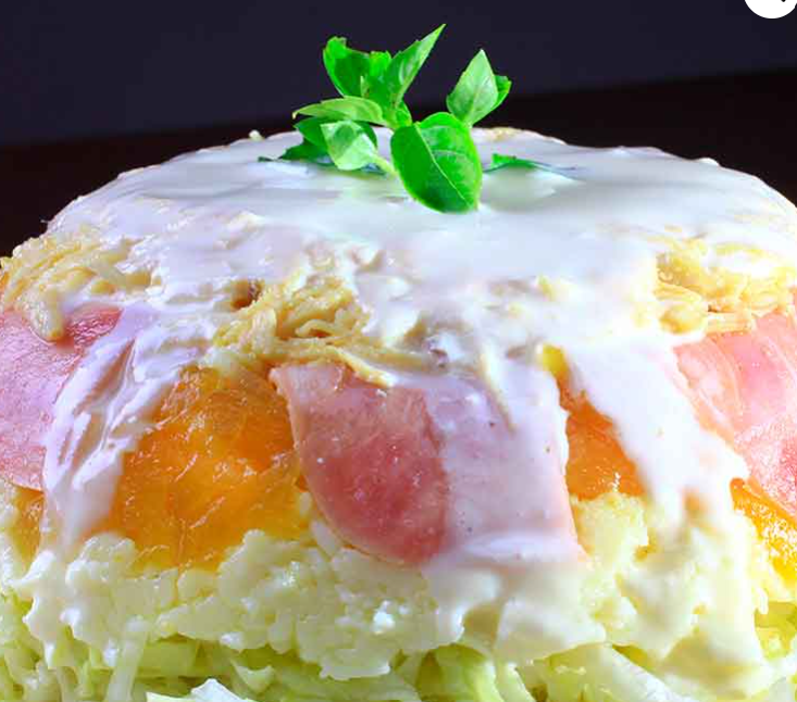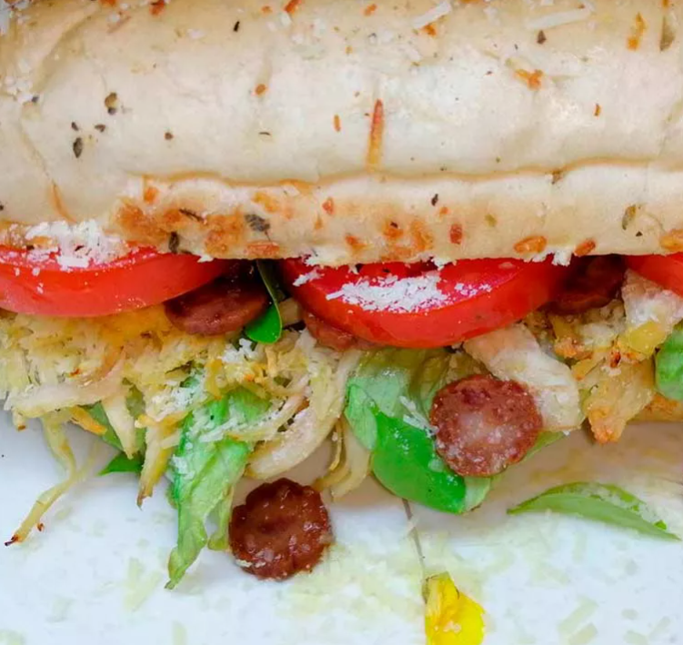 Pan, carne hecha en casa, jamón, pollo, cabanos, tomate, salsa de la casa, lechuga, mozzarella, tocineta fina, cebolla salteada.