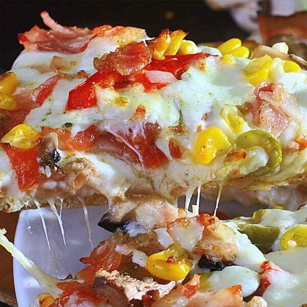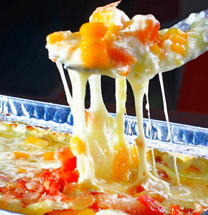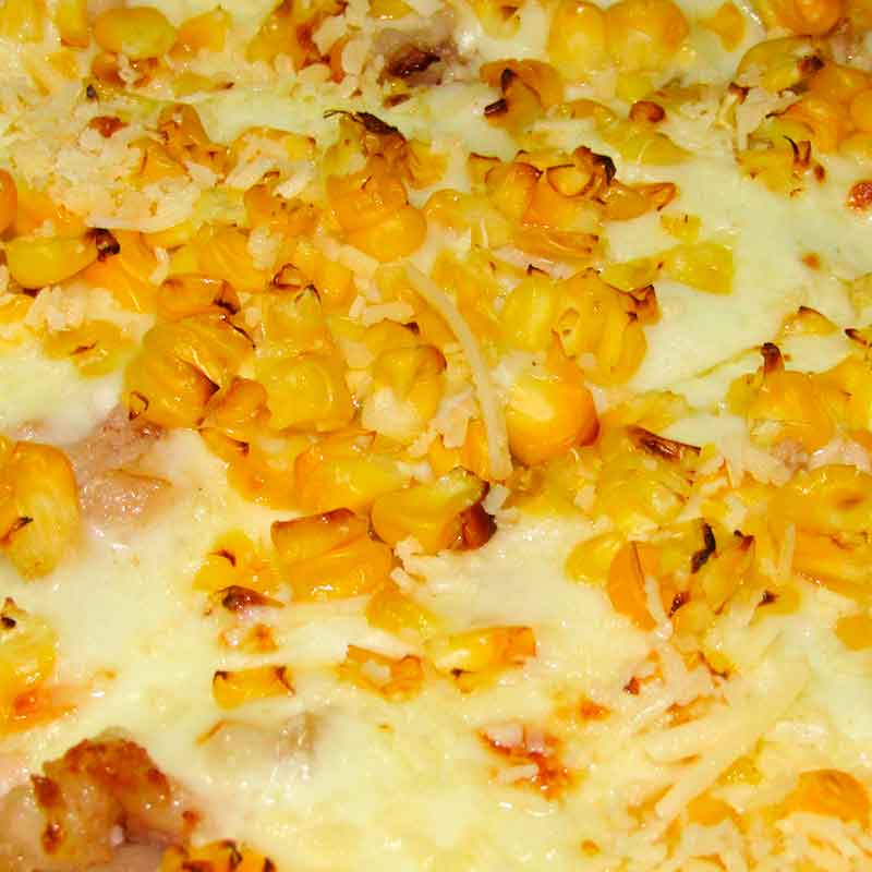 Con queso gratinado, maíz tierno, pollo, tocinetas.