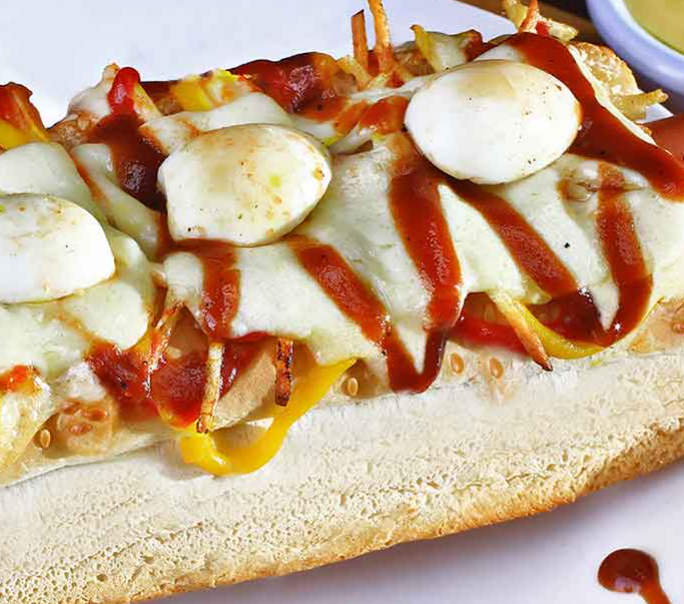 Pan, salchicha viena, pollo, huevo codorniz, ripio papa, salsa BBQ, cebolla, queso gratinado, tocineta.
