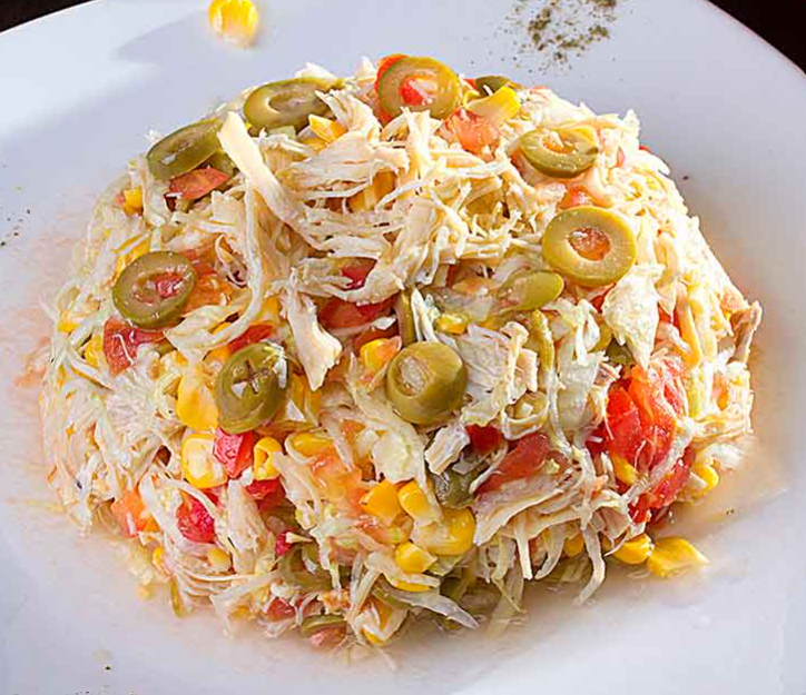 Pollo, lechuga, tomate, maíz tierno, aceitunas, especias.