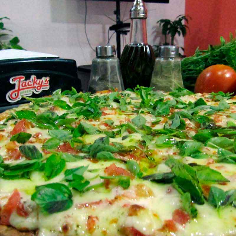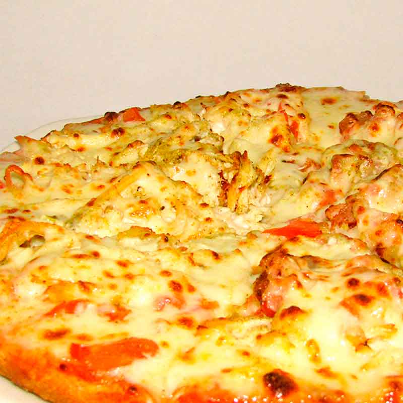 Pollo, cabanos, parmesano, cheddar, tomate, lechuga, albahaca, salsa de ajo.
