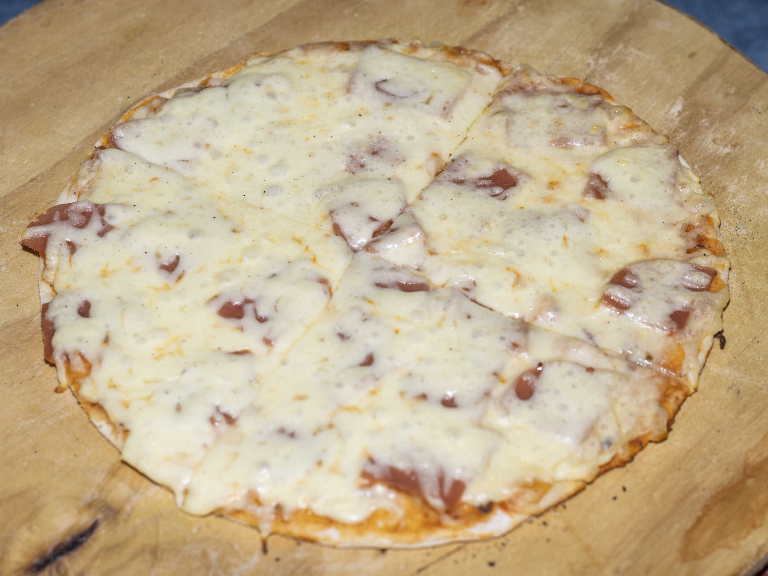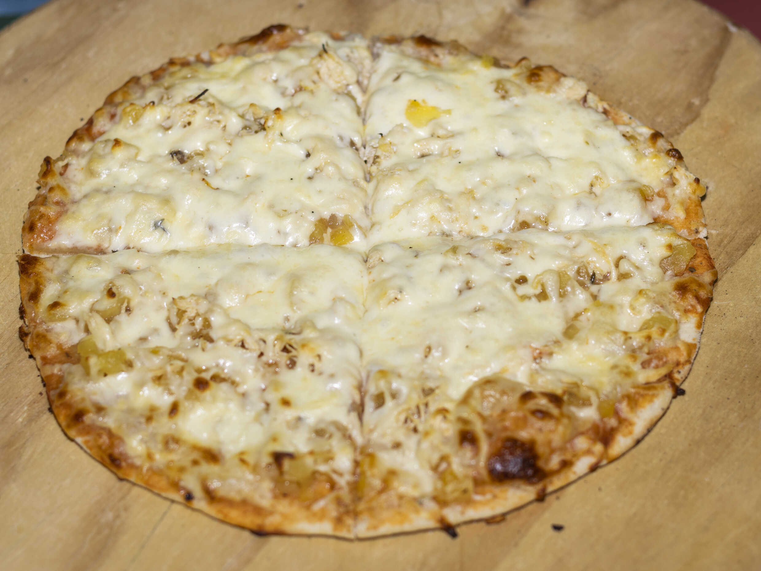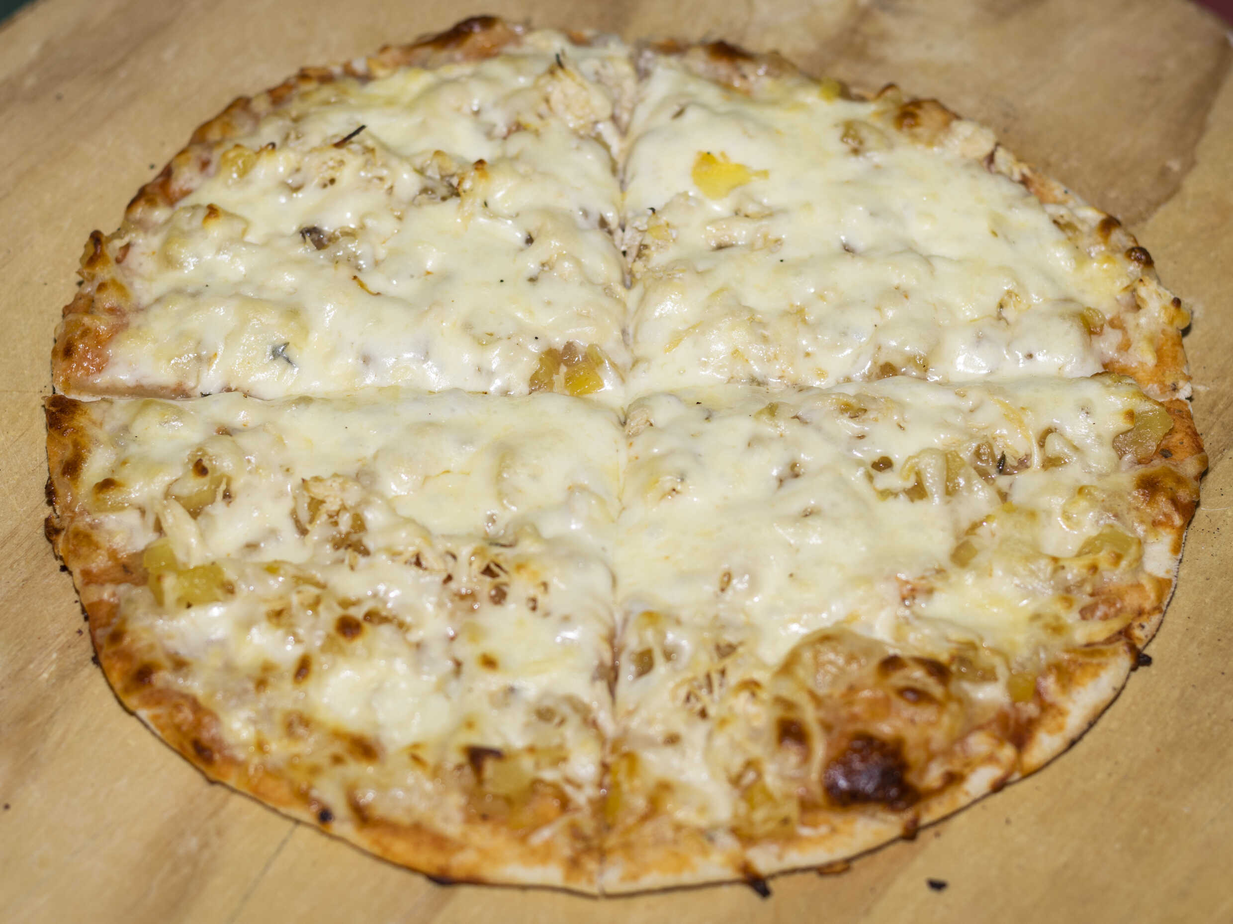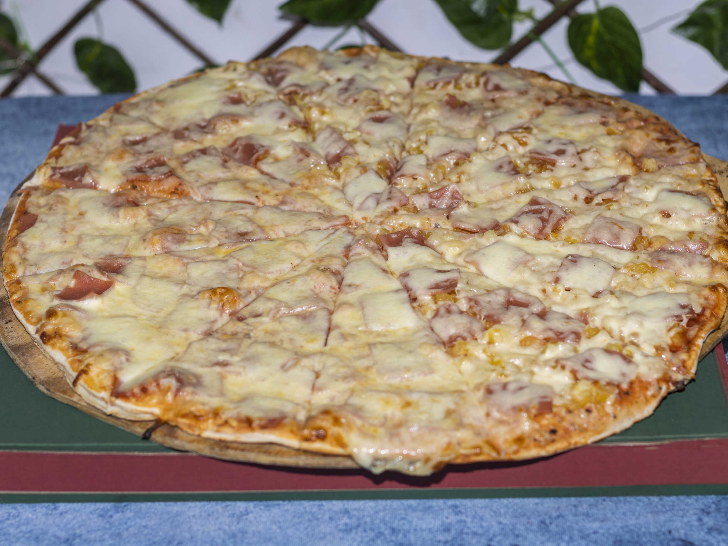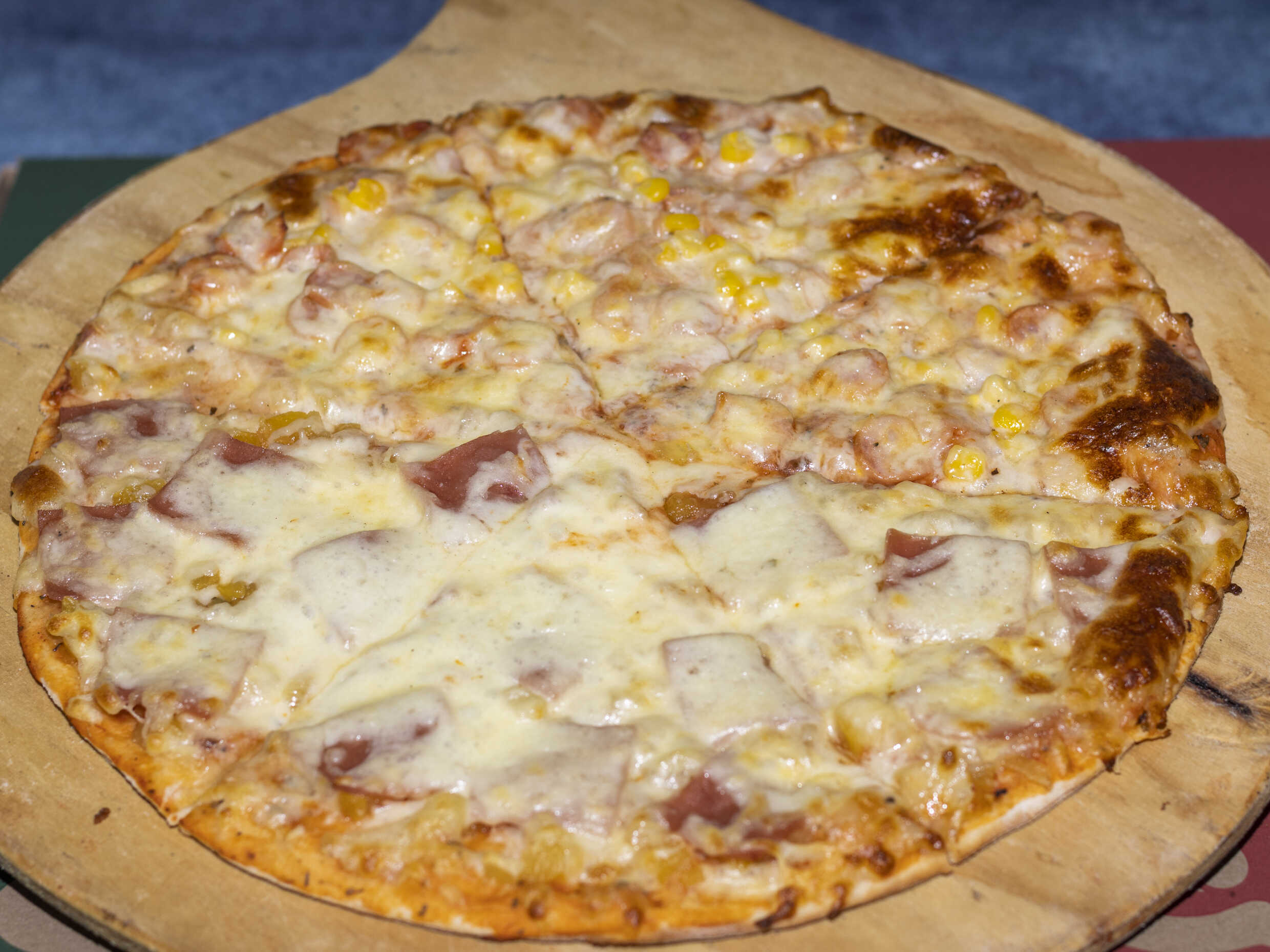 Pizza 4 porciones, 21 cms, elaborada con masa artesanal, salsa napolitana Mitad Hawaiana y Mitad Jamon Queso