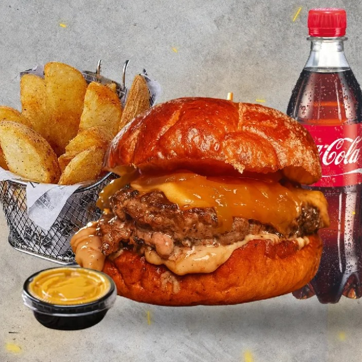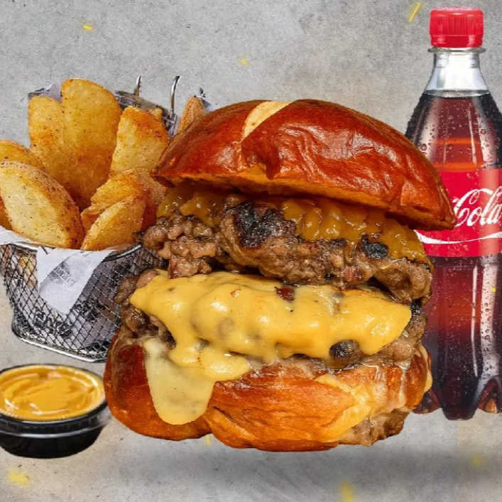 Hamburguesa clásica doble, papas en cascos, salsa especial de la casa más bebida a elección.