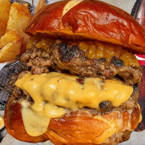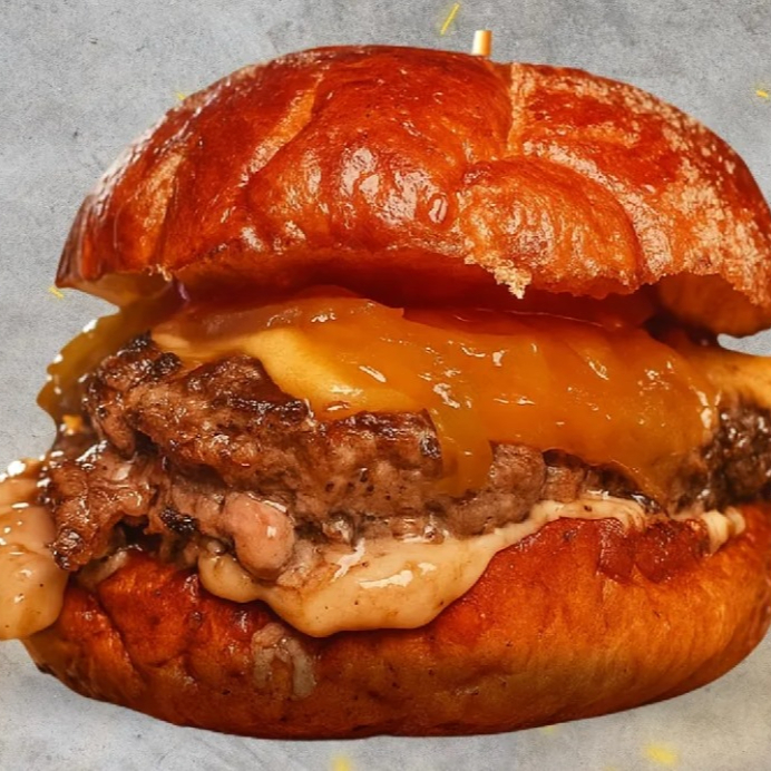 300 g De carne angus asada al carbón, queso americano, tocineta ahumada asada al carbón, cebolla caramelizada, tomate grillado, salsa especial de la casa y pan brioche.