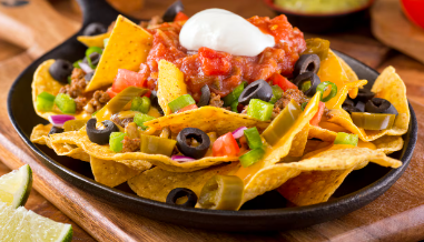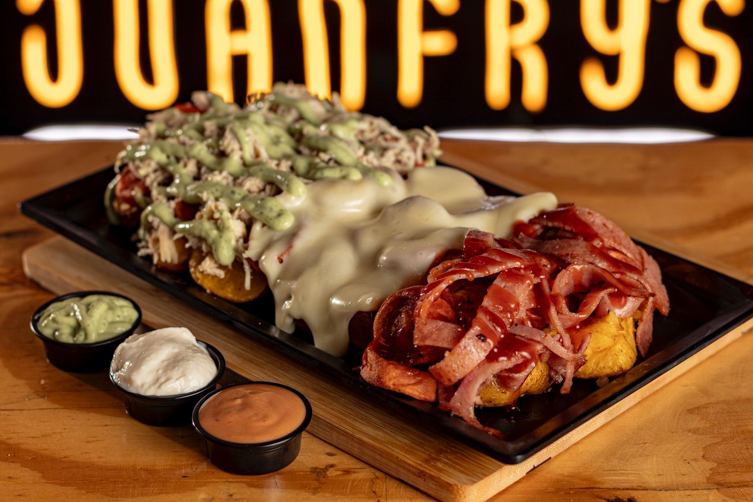 Pollo, carne desmechada, frijoles refritos, queso, pico de gallo, guacamole, salsa cheddar, salsa de ajo, jalapeños.