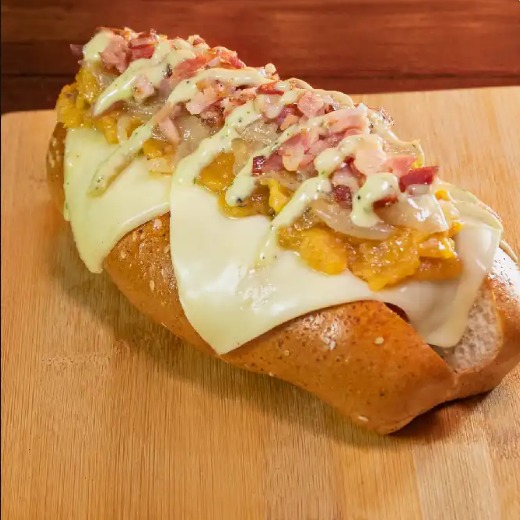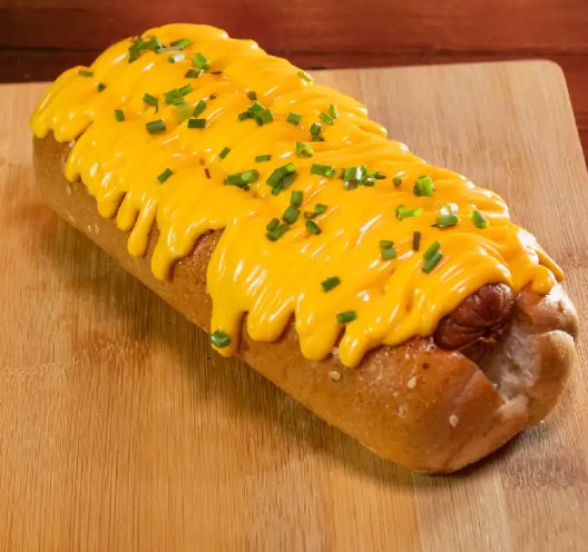 Salchicha americana, queso cheddar, tocineta ahumada, cebolla grillé, salsas de la casa, acompañado con papas criollas.