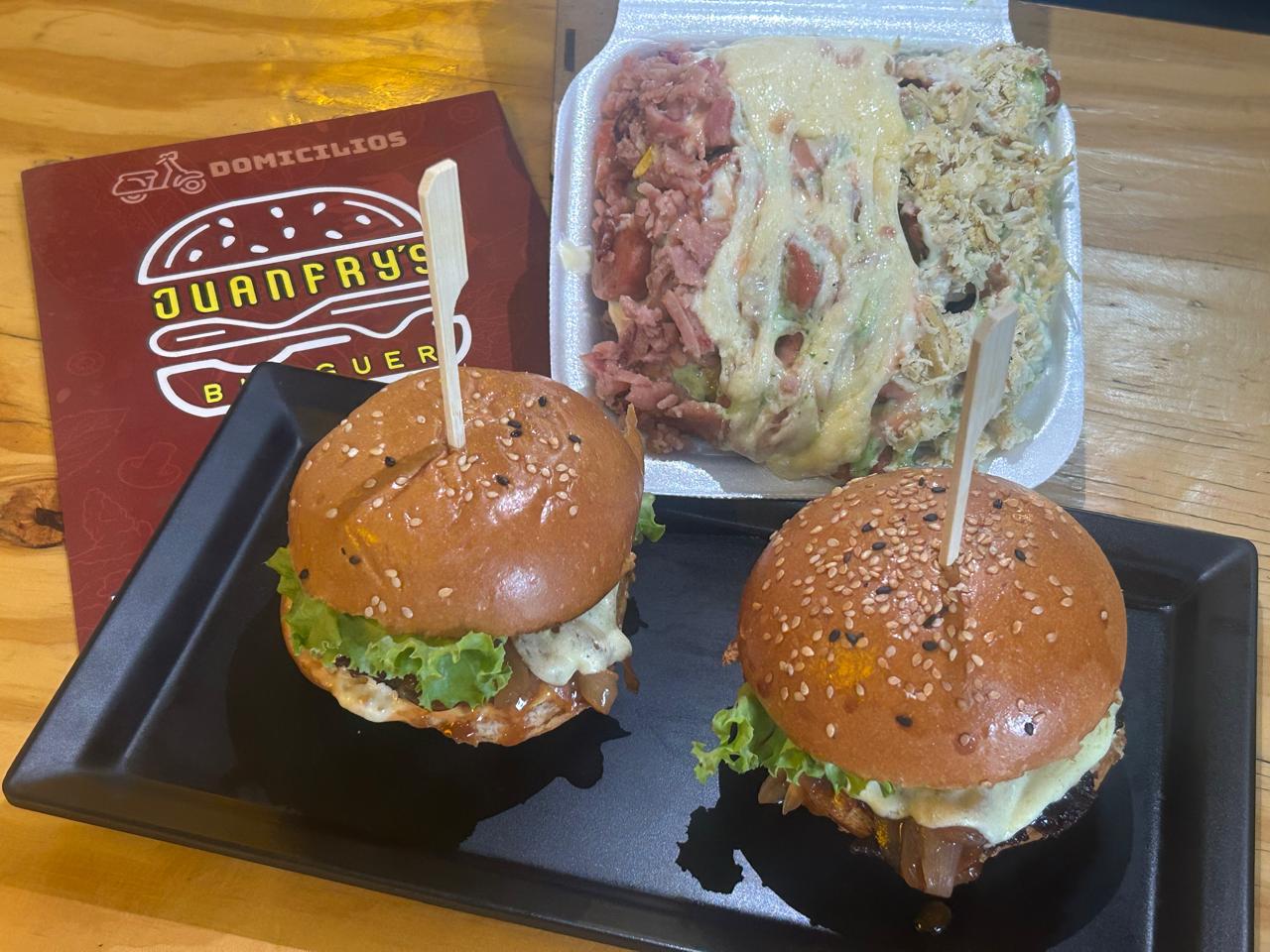 SalchiEspecial (Pollo, tocineta, salchicha, queso, acompañado de papa criolla y salsas de la casa) + 2 hamburguesas Callejeras (Carne artesanal 100% angus, pan brioche, cebolla grillé, tomate, lechuga, queso, salsa de la casa)